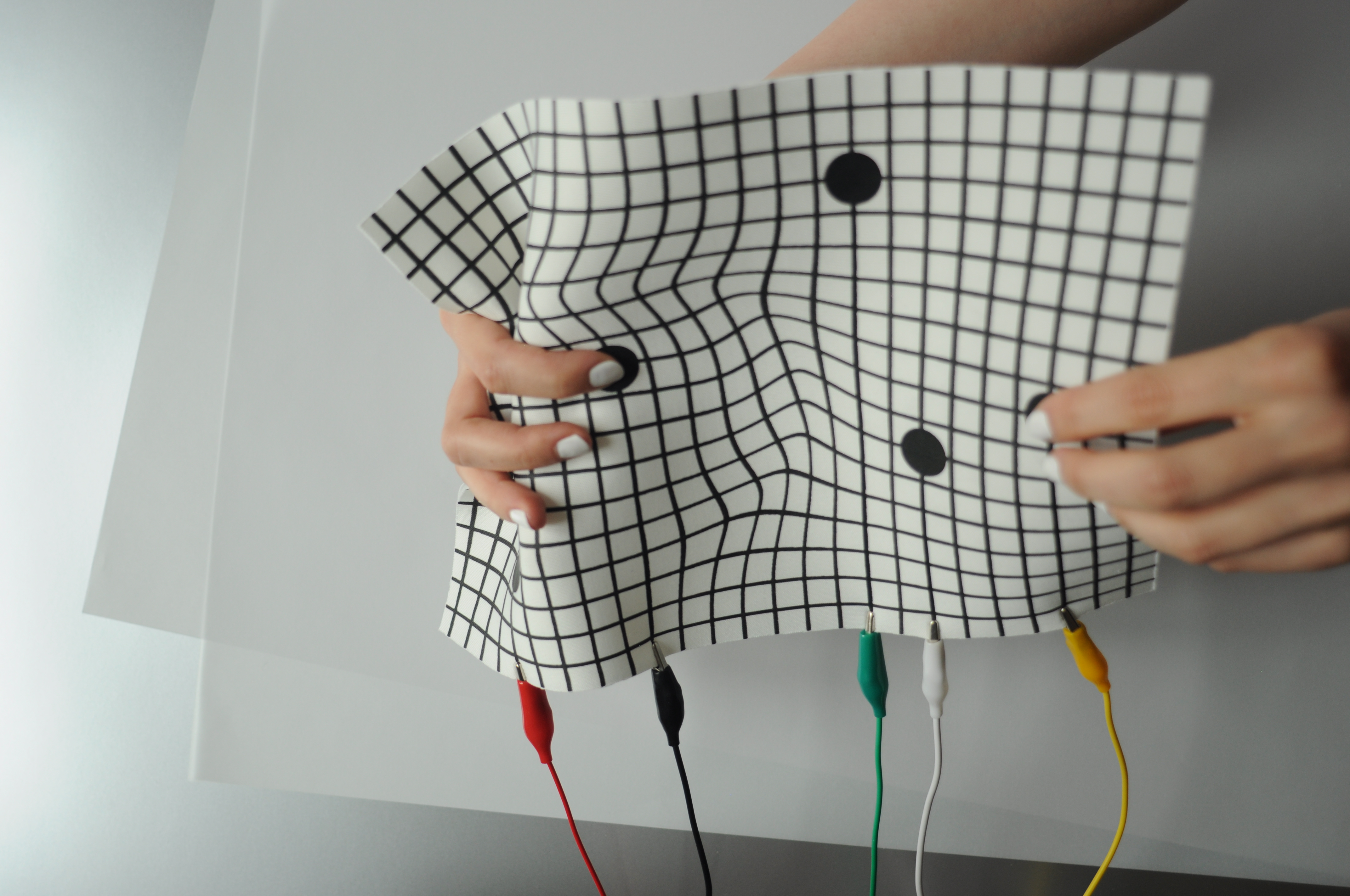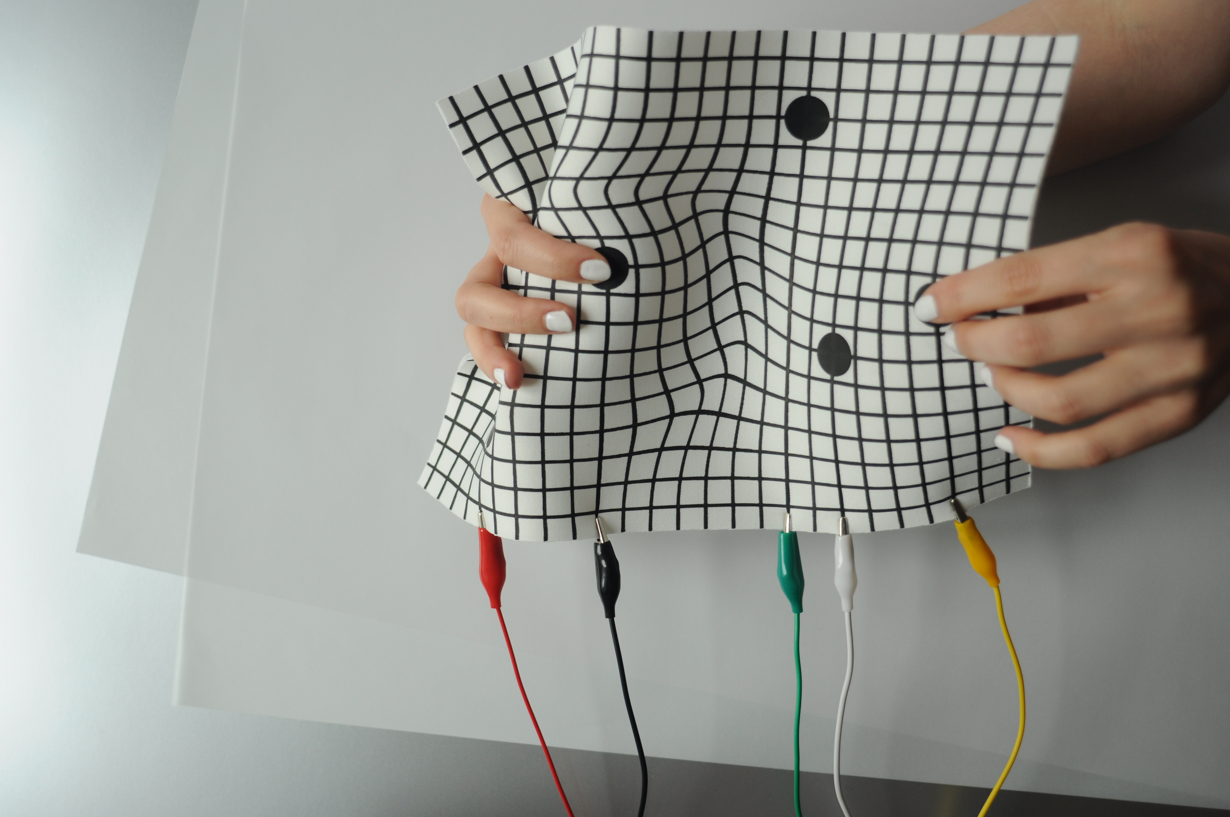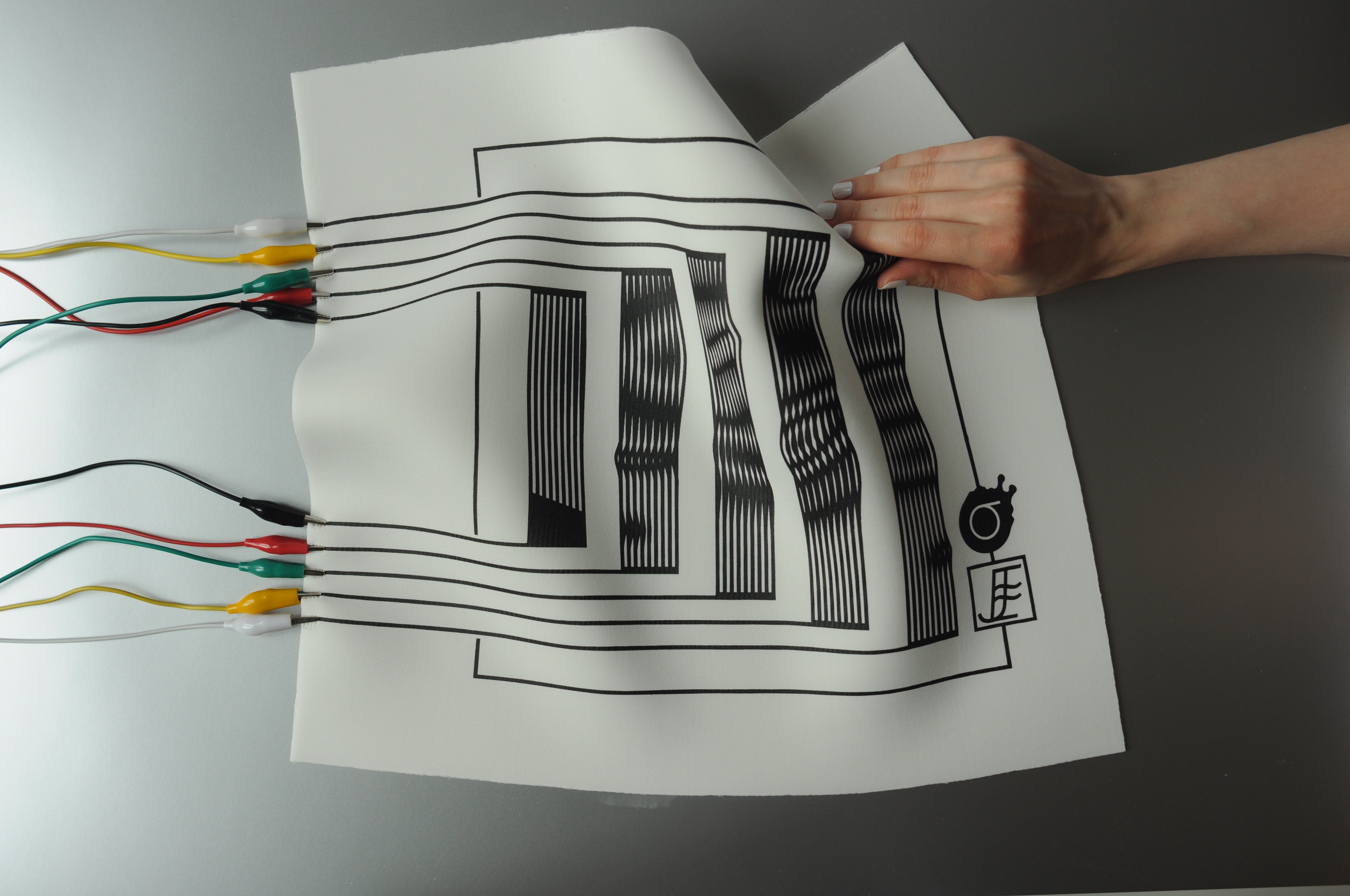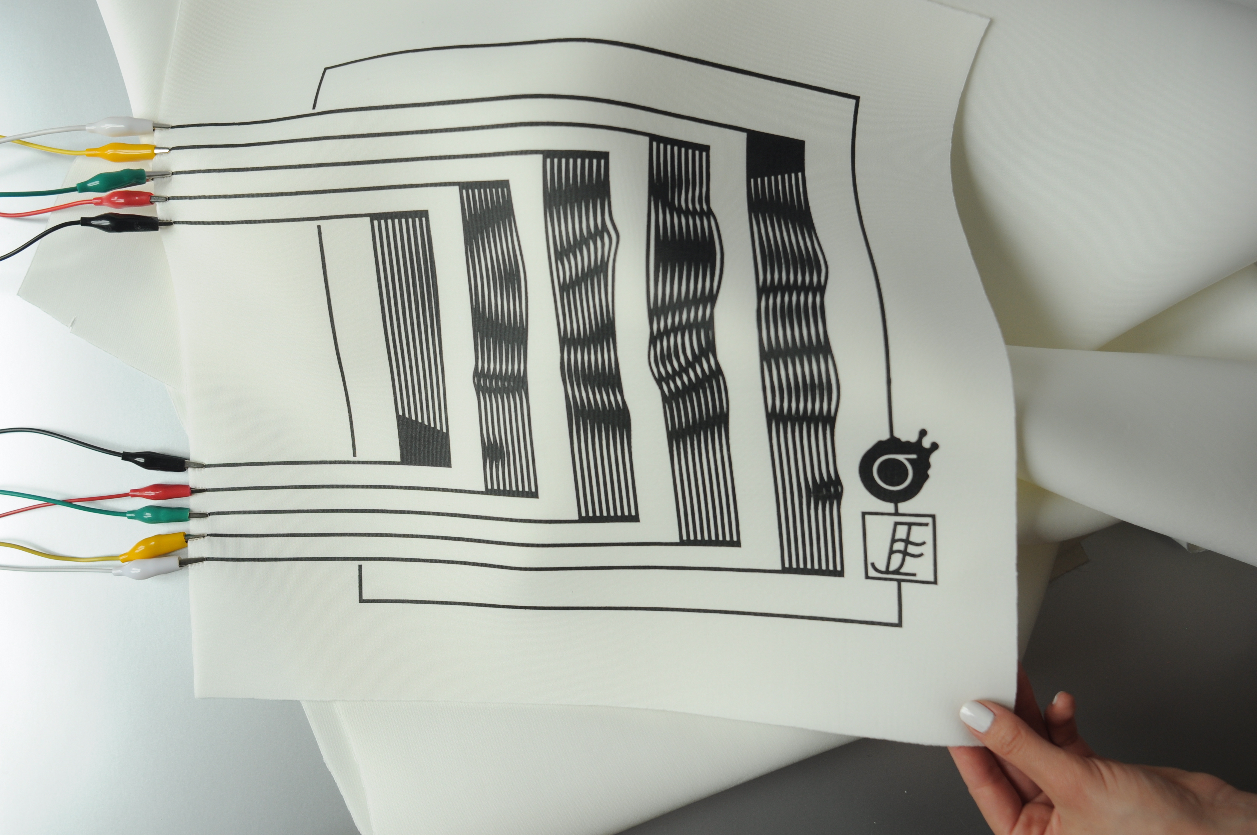 An experimental modular textile interface for sonic interactions, exploring aesthetics and morphology on contemporary interaction design. Trigger pads and fader board are screen printed modules focused on AV performances, allowing the performer to build its set up regarding its needs.