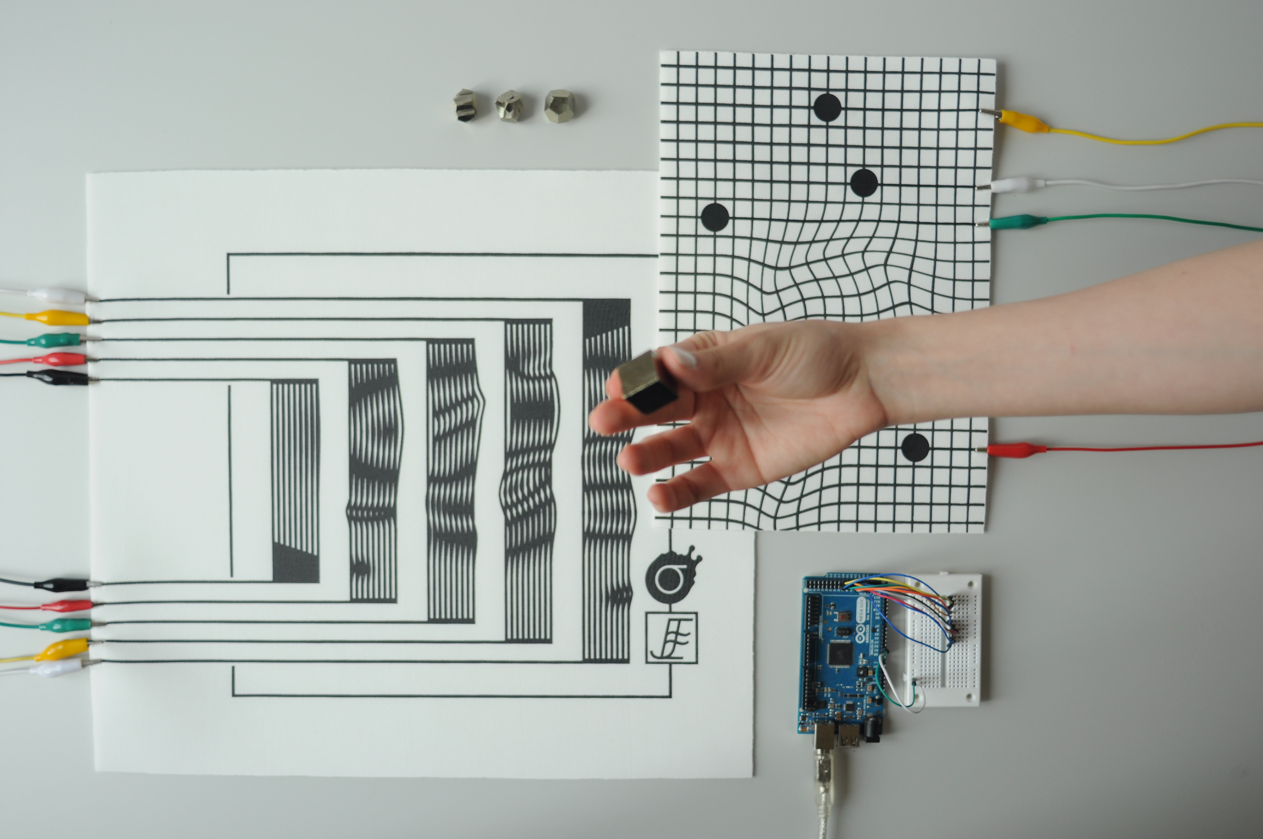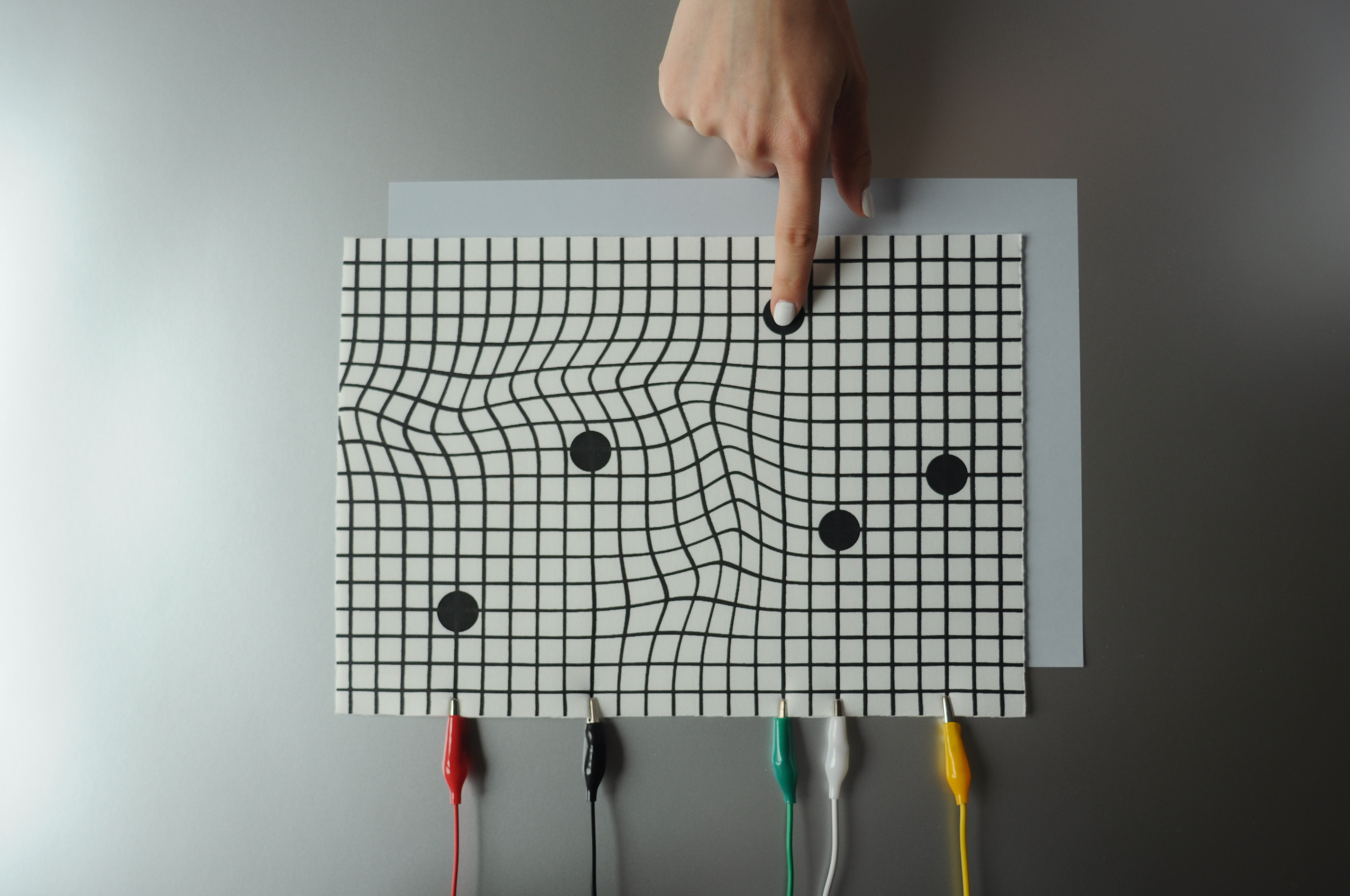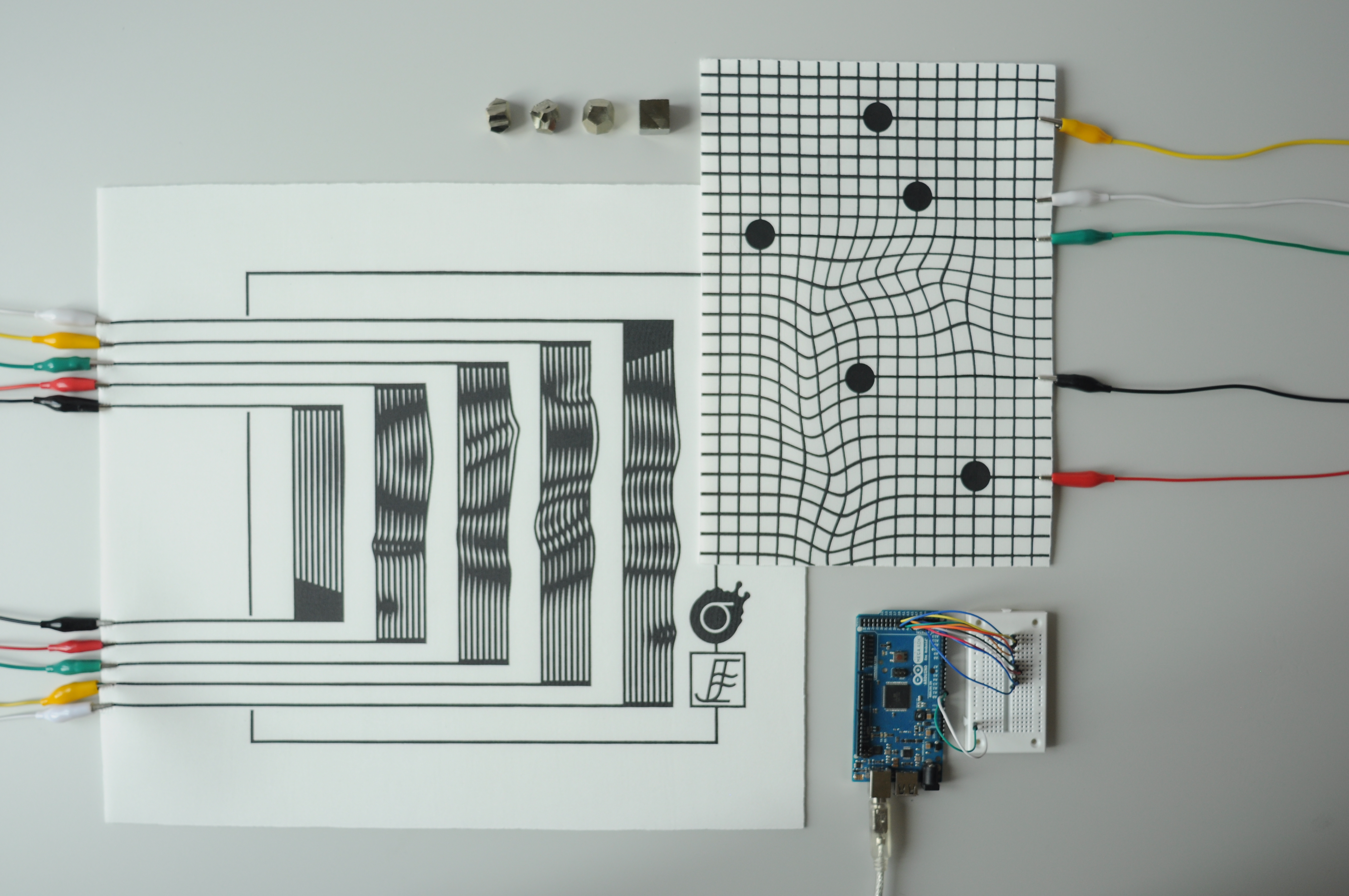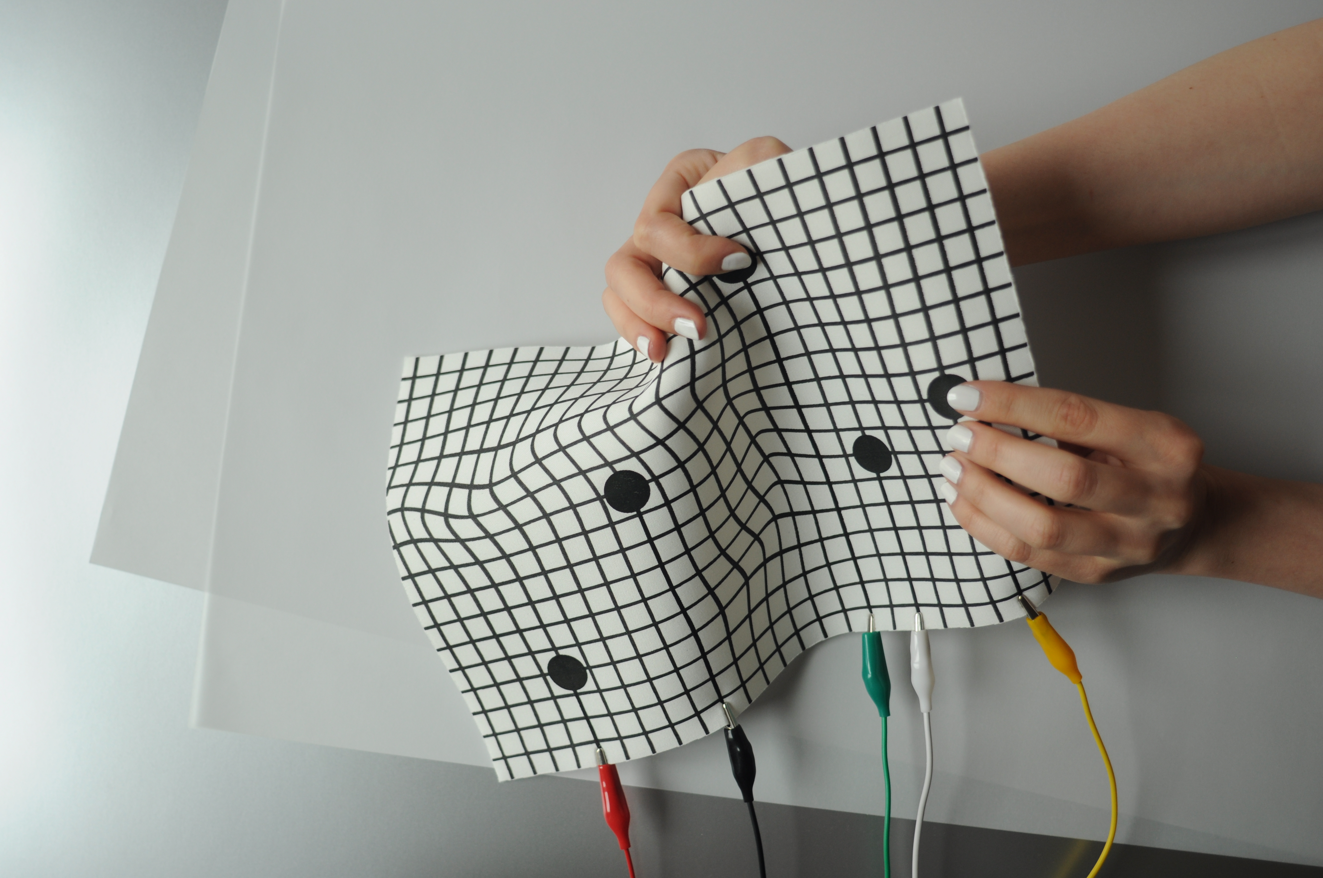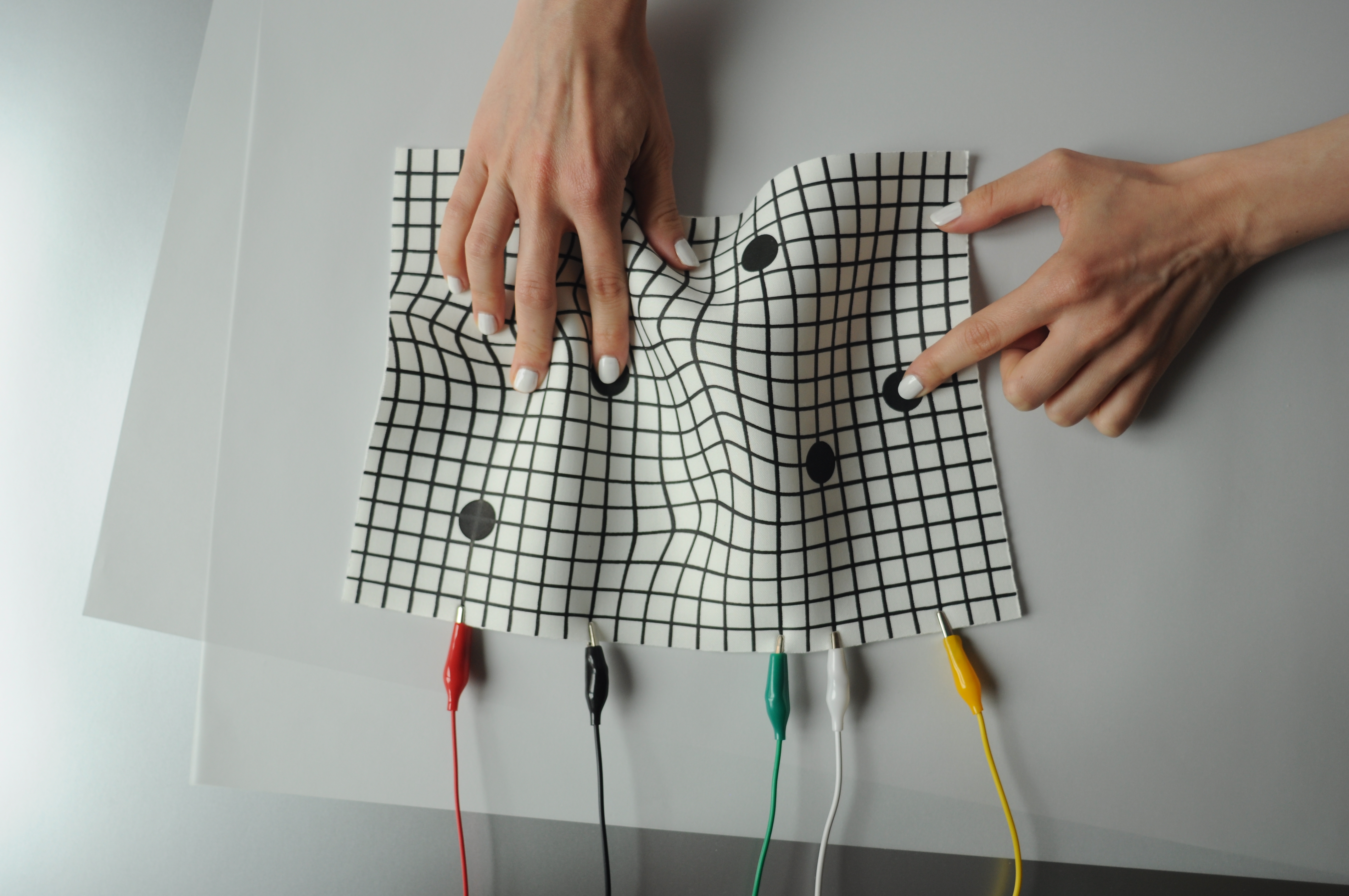 An experimental modular textile interface for sonic interactions, exploring aesthetics and morphology on contemporary interaction design. Trigger pads and fader board are screen printed modules focused on AV performances, allowing the performer to build its set up regarding its needs.